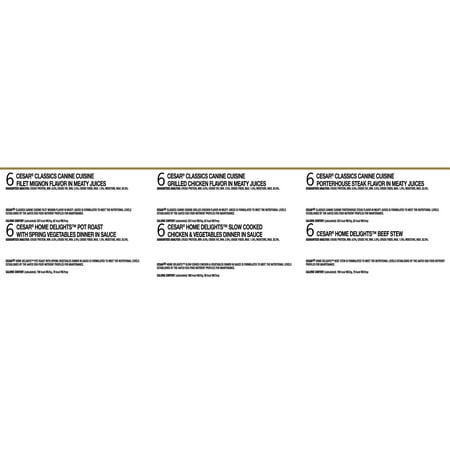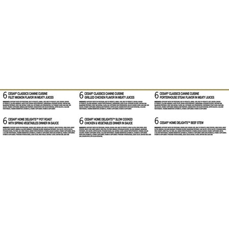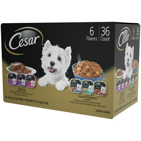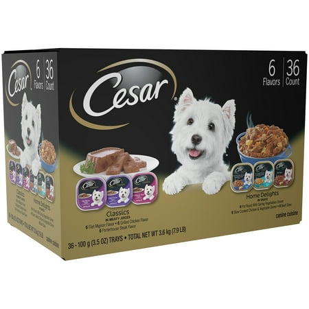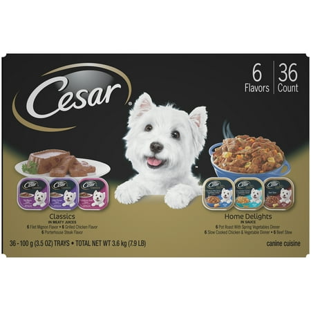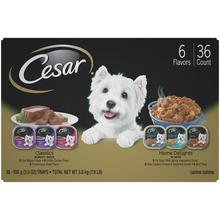 - Totally contains (36) 3.5 ounces of CESAR Family Happy and Canine gourmet trays in a total of 6 flavors: beef stew (6), slow boiled chicken and vegetables (6), spring vegetable pot roast (6), fillets Mignon ( 6), Porterhouse Steak (6) and Roasted Chicken (6) Variety Packaging Dog Food