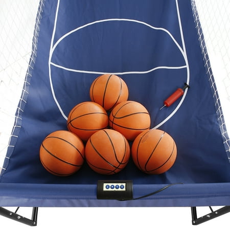- includes (6) 7-inch basketball, pump with needle, 2 basketball nets, and AC/DC power supply