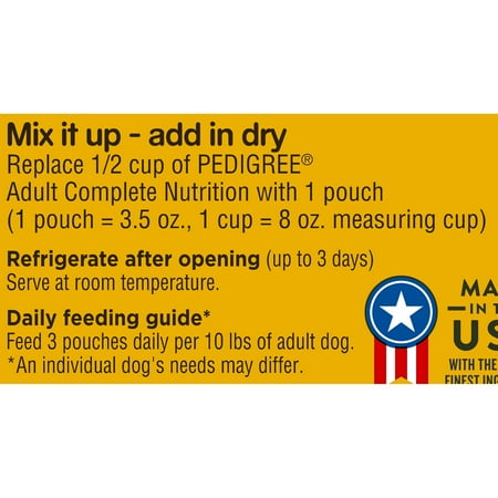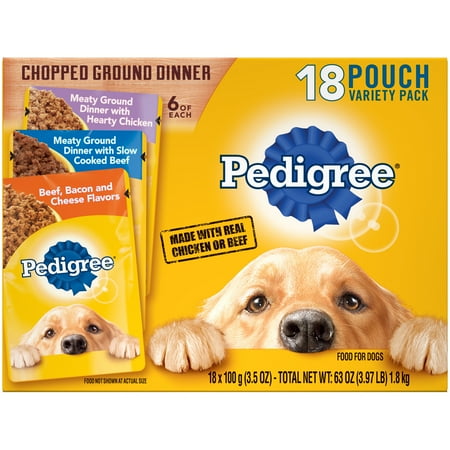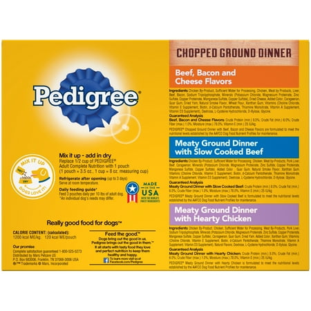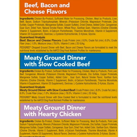 - contains (18) 3.5 oz PEDIGREE chopped ground dinner wet dog food bag: (6) hearty chicken (6) Slow-cooked beef; (6) Beef, bacon and cheese