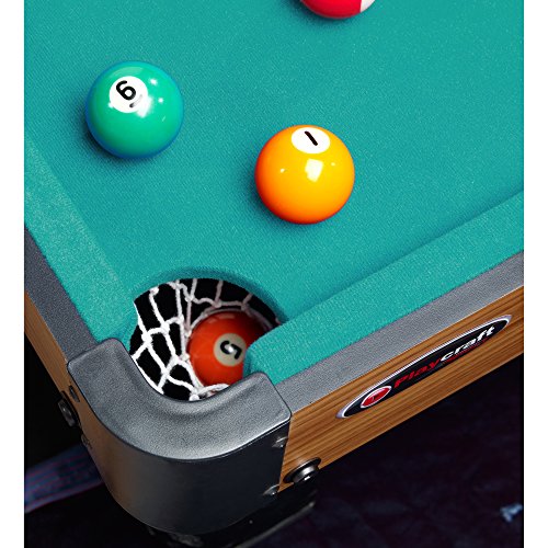Playcraft Bank Shot 40 "The mini pool table is sure to make children popular! Simply connect the legs quickly and start playing. Use this popular Playcraft Sport 40" including the pool table; 2 - 36" clues , 15 ball racks, a set of billiard balls, the main ball, chalk and brushes.Quick set - just connect the legs